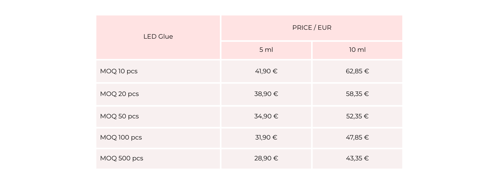 The procedure for eyelash extensions application requires max. 2 drops of glue. The glue no longer dries on the glue base as fast as it needs LED light to cure. You no longer have to worry about the temperature and humidity in the room. The glue has a low level of odor and vapors. It does not irritate the eyes because the glue cures immediately and the glue vapors do not activate even after taking a shower.